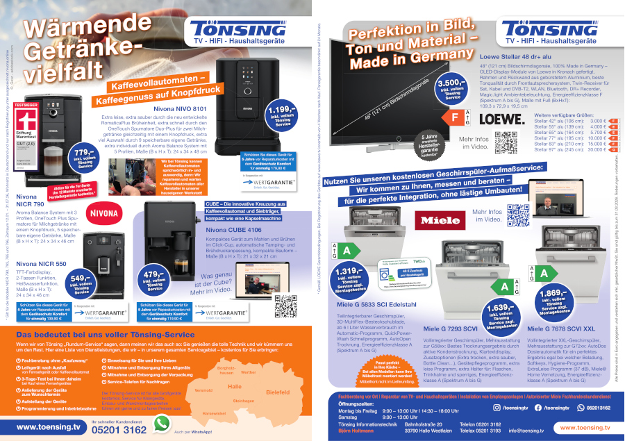 In unserem aktuellen Werbeflyer präsentieren wir Kaffeeautomaten des Herstellers Nivona, den Loewe Stellar OLED TV und verschiedenen Geschirrspüler des Herstellers Miele.
